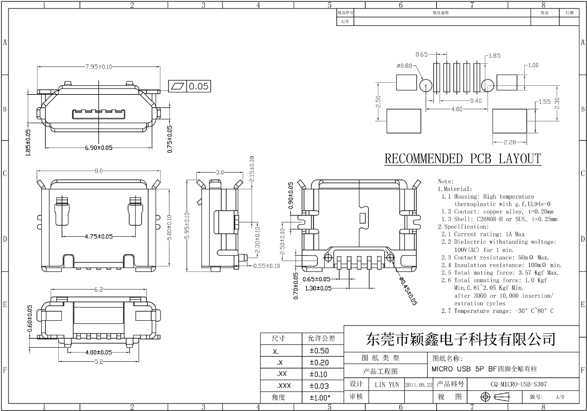 接触阻抗:30mΩ MAX.INITIAL;40mΩ MAX AFTER 10000CYCLES